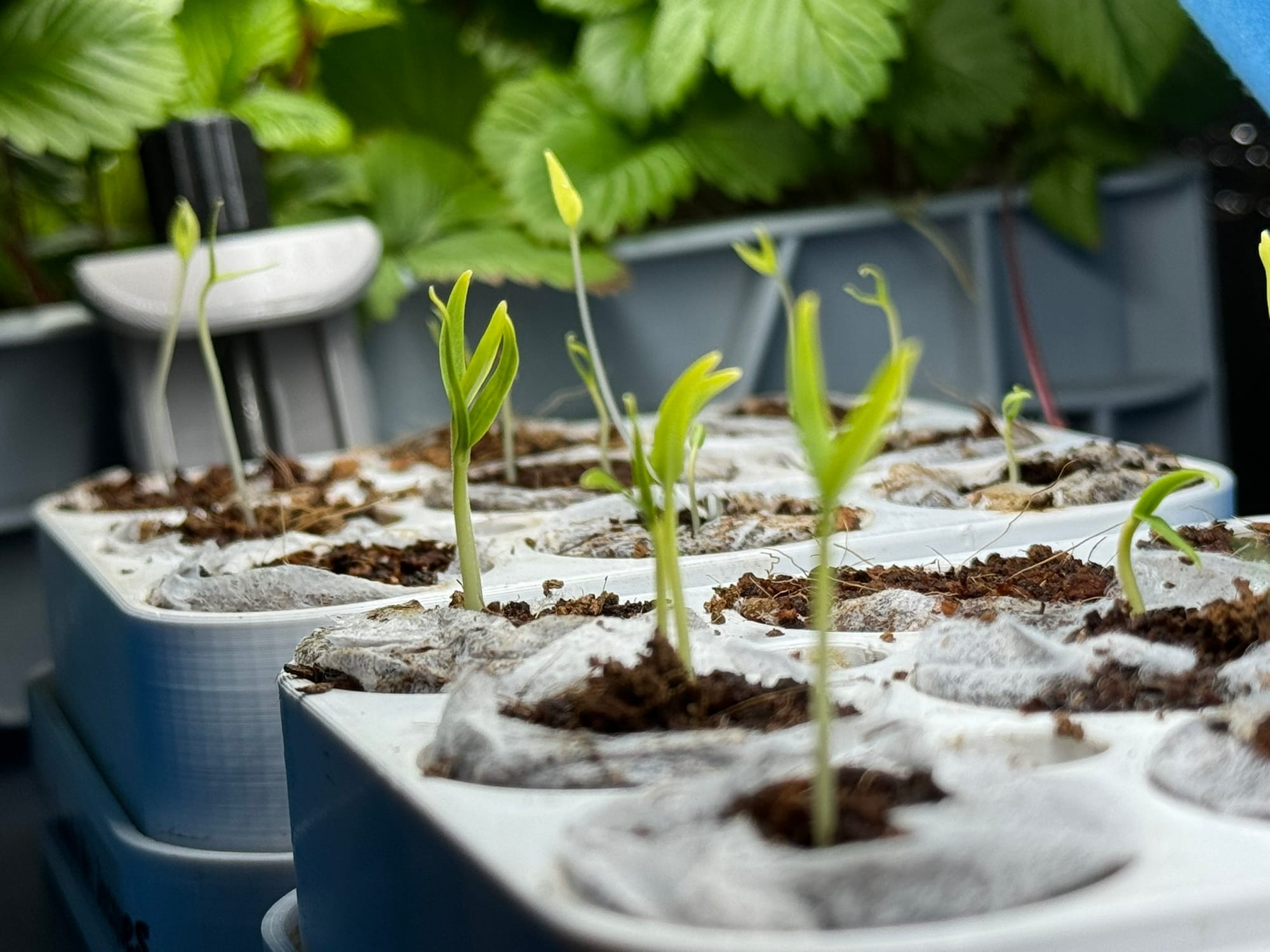 For my precious seedlings, I've transformed the bottom of my old foldable dining table into a dedicated grow box with grow lights and reflective walls. I live in a one-bedroom apartment, and spring is always a challenge for me to fall asleep as these seedlings usually need around 16 hours of intensive light. The solution was always to have them in the bathroom and blast them with light over there. I finally shoved my excuses away, put two 20W TLED lights in the table, and paneled all sides with hard foam panels.